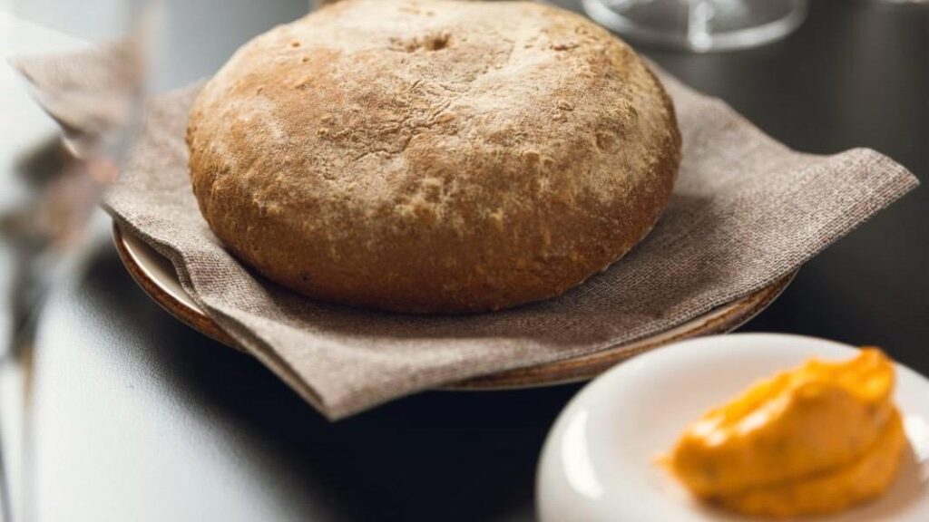 La ragazza torna al tavolo con un piatto tra le mani. Lo appoggia piano: una pagnotta di pane integrale, la crosta scura e viva, ancora tiepida al tatto. Accanto, poggia una piccola ciotola con il burro montato, al lime e pepe rosa, chiaro, soffice, attraversato da minuscoli riflessi rosati. Più in là, un’altra ciotola: cracker di mais con sale Maldon appoggiati su grani grossi, l’origano che disegna macchie verdi sulla superficie. Spezzo il pane. Il vapore sale appena. Il burro cede subito, si scioglie, lucido, si insinua nella mollica calda. Un profumo fresco attraversa il tavolo, netto, quasi agrumato.