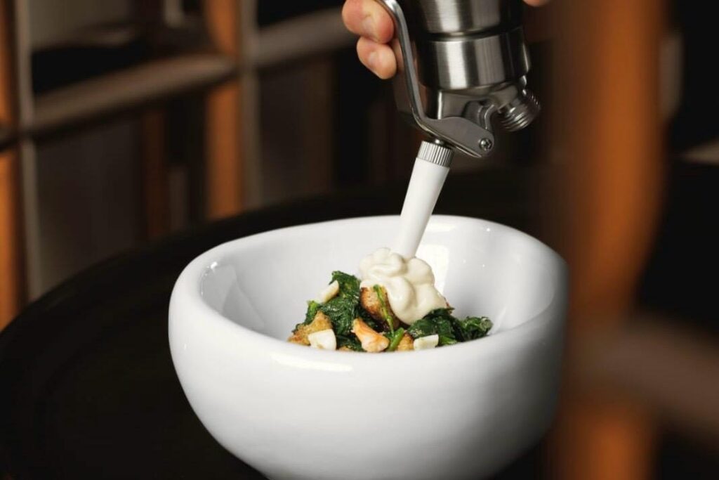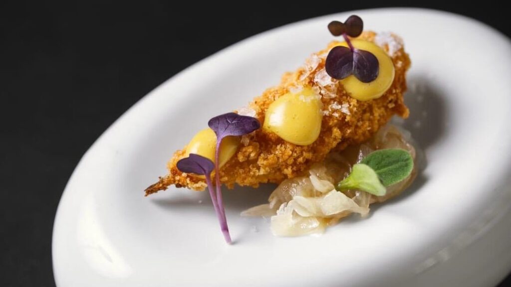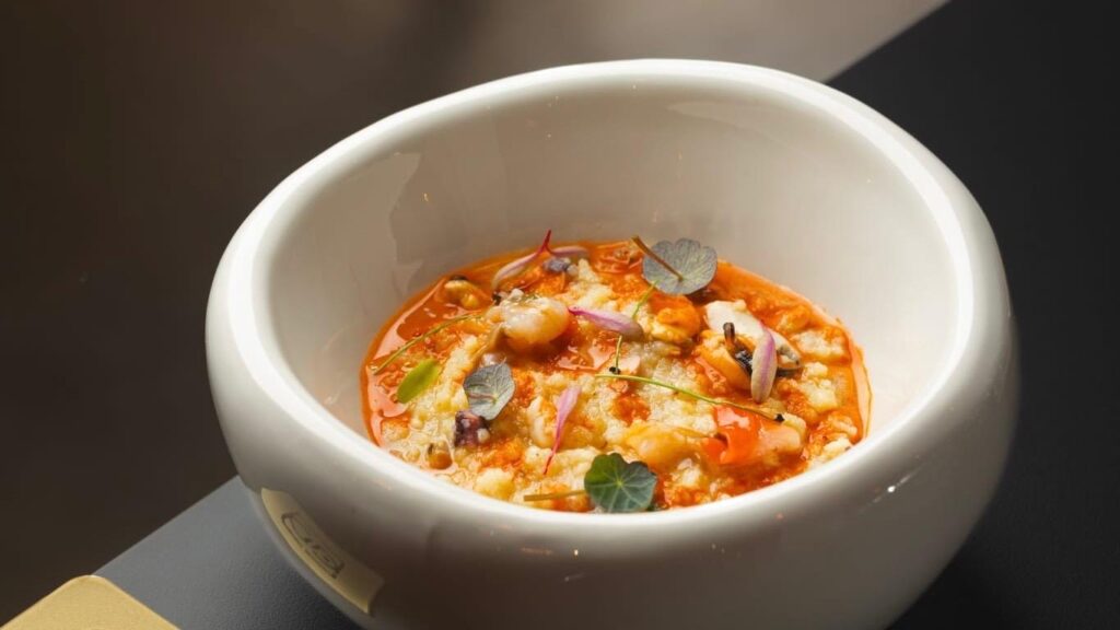 La ragazza arriva con il piatto, ma Pierluigi la accompagna, sorridendo come chi sta per mettere alla prova un foggiano: «Ora proverai il mio pancotto». Lo guardo divertito. «Da queste parti ne ho mangiati parecchi». Al centro del piatto si posa una patata sifonata, una nuvola chiara e soffice, appena increspata, che sembra adagiarsi lì per gravità più che per gesto. Sotto affiorano frammenti di pane dorato, riflessi rosati di gambero, anelli lucidi di calamaro, il polpo più scuro. Intorno corre una crema verde di cime di rapa e cicoria saltate, intensa nel colore, quasi amara già al profumo, a disegnare il perimetro del piatto. Affondo il cucchiaio. La nuvola cede senza resistenza, scivola, si apre. Il pane reagisce con un crunch netto, poi arriva l’onda del boccone: l’umami marino si allarga, profondo e persistente, la crema vegetale porta una tensione amara che pulisce e rilancia, la parte soffice lega tutto. Il mouthfeel è stratificato, pieno ma sorprendentemente leggero. Guardo Pierluigi. «Questo non è un pancotto. È un mare che sa di casa». Sorride, soddisfatto. «Allora ci siamo capiti».