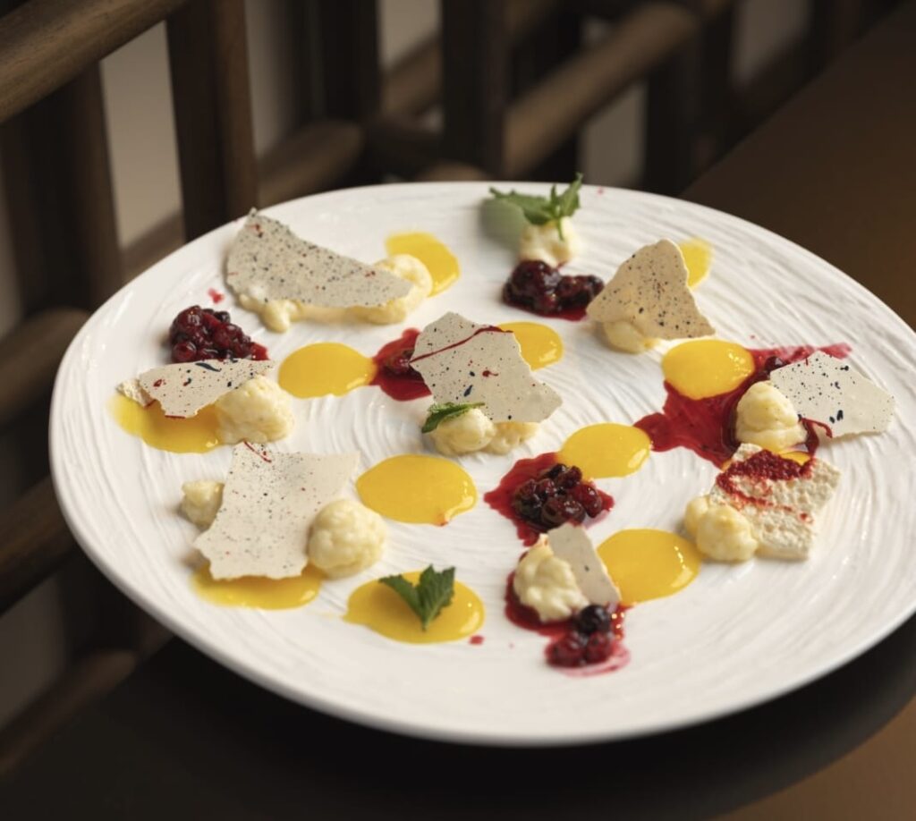 Arriva il dolce. Tre sfere di crema diplomatica alla vaniglia si appoggiano leggere sul piatto, intervallate da frammenti di meringa sfogliata, colature rubino di coulis ai frutti di bosco, pennellate luminose di lemon curd, pieno e verticale. Affondo il cucchiaino. La crema è setosa, avvolgente, la vaniglia resta lunga e pulita. La meringa si spezza in un crack sottile, porta aria e dolcezza, il frutto rosso entra con una freschezza immediata, mentre il limone stringe il finale con una tensione acida netta, precisa. Il boccone resta in equilibrio, mai stucchevole, sempre vivo.