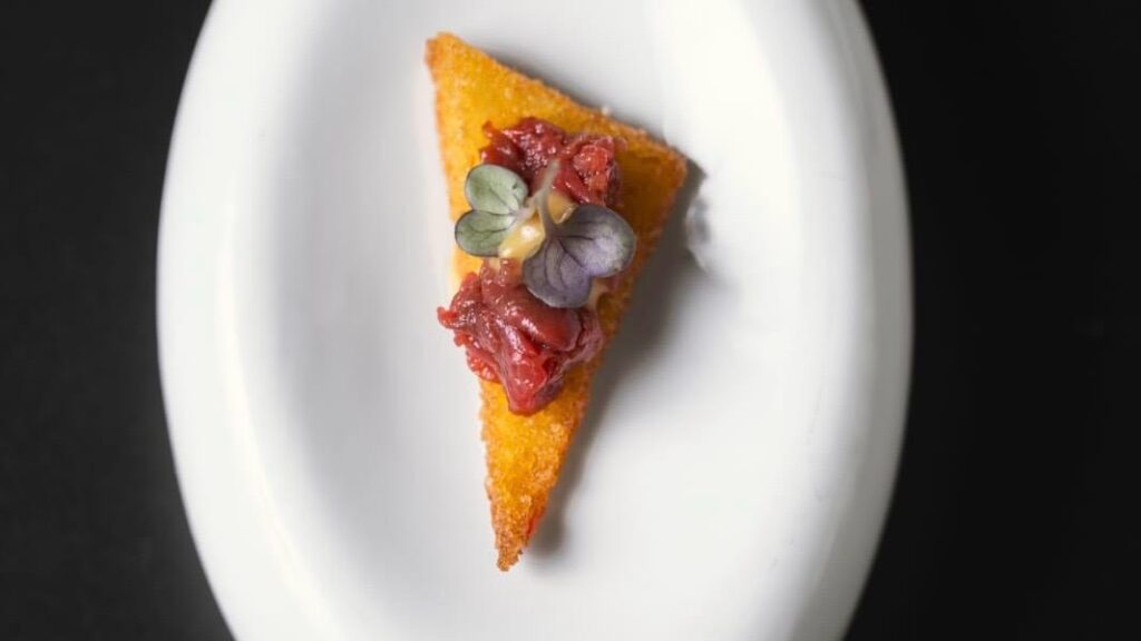 Arriva una cialda di polenta, uno scagliozzo foggiano sottile e dorato, che regge una battuta di filetto di cervo al naturale e un ketchup di datterino giallo, acceso, solare. La cialda si spezza con un suono secco, poi in bocca si apre morbida, calda, piena: un mouthfeel sorprendente, che gioca tra croccantezza e delicatezza. La carne è dolce, quasi carezzevole, il vegetale illumina il morso. Guardo Pierluigi. «Avevi ragione. Questo cervo non scappa da nessuna parte». Lui sorride, soddisfatto, e torna verso la cucina.