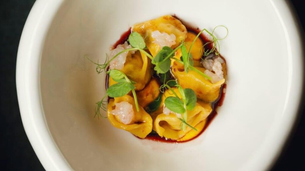 Agnolotto del plin all’arrosto di coniglio, crema di carote, cipolla di Tropea, finocchietto, gambero rosa