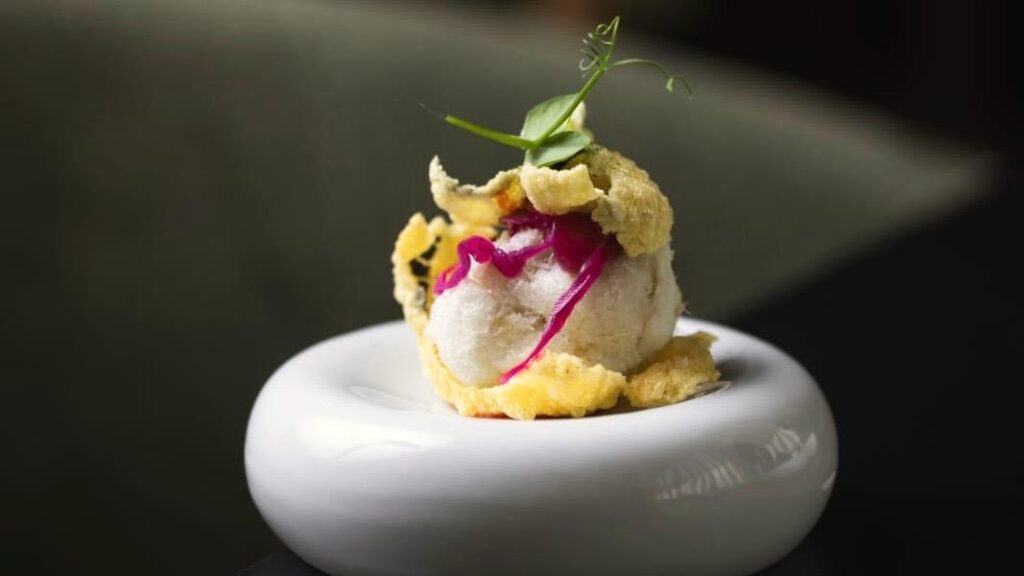 Arriva il baccalà come una piccola scena in equilibrio: il bianco pieno della mantecatura incastonato tra due cialde sottilissime di riso, dorate allo zafferano e al nero di seppia. Un filo lucido di gel di cipolla di Tropea attraversa la superficie, il cavolo rosso in osmosi aggiunge una vibrazione cromatica, quasi un colpo di pennello. Lo sollevo tra le dita. È leggerissimo, fragile alla pressione, come se potesse spezzarsi prima ancora di arrivare alla bocca. Il morso è unico. La cialda si frantuma con un crack sottile, immediato: il mouthfeel gioca tra croccantezza aerea e una cremosità setosa che riempie il palato senza peso. Il baccalà scorre, rotondo, salino, la cipolla porta una tensione acida che accende il centro del boccone, il cavolo allunga il finale con una nota vegetale fresca. Tutto resta pulito, preciso, luminoso. È uno di quei bocconi che si ricordano più per la sensazione che per la forma.