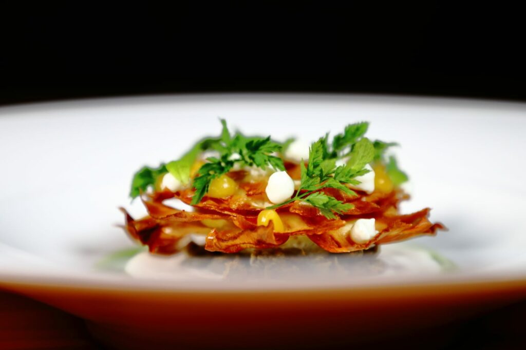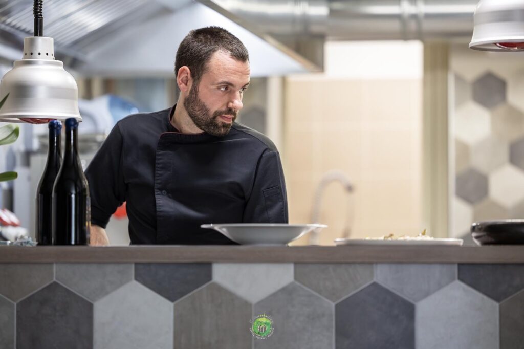 La sua cucina si regge su tre direttrici. La prima è il rispetto assoluto dell’ingrediente, utilizzato nella sua interezza secondo una logica no–waste: bucce, scarti e parti meno nobili diventano salse, estratti, polveri e consistenze. La seconda è la ricerca tecnica, con fermentazioni, infusioni e lavorazioni che ampliano lo spettro gustativo e introducono profondità, acidità e umami. La terza è il legame con chi produce: piccoli agricoltori, realtà biologiche e fornitori scelti per coerenza e qualità. Il risultato è una cucina contemporanea ma concreta, capace di unire precisione e leggerezza. Piatti che non urlano, ma raccontano: territorio, stagioni e una visione personale in cui il vegetale non è mai un limite, ma un orizzonte creativo.