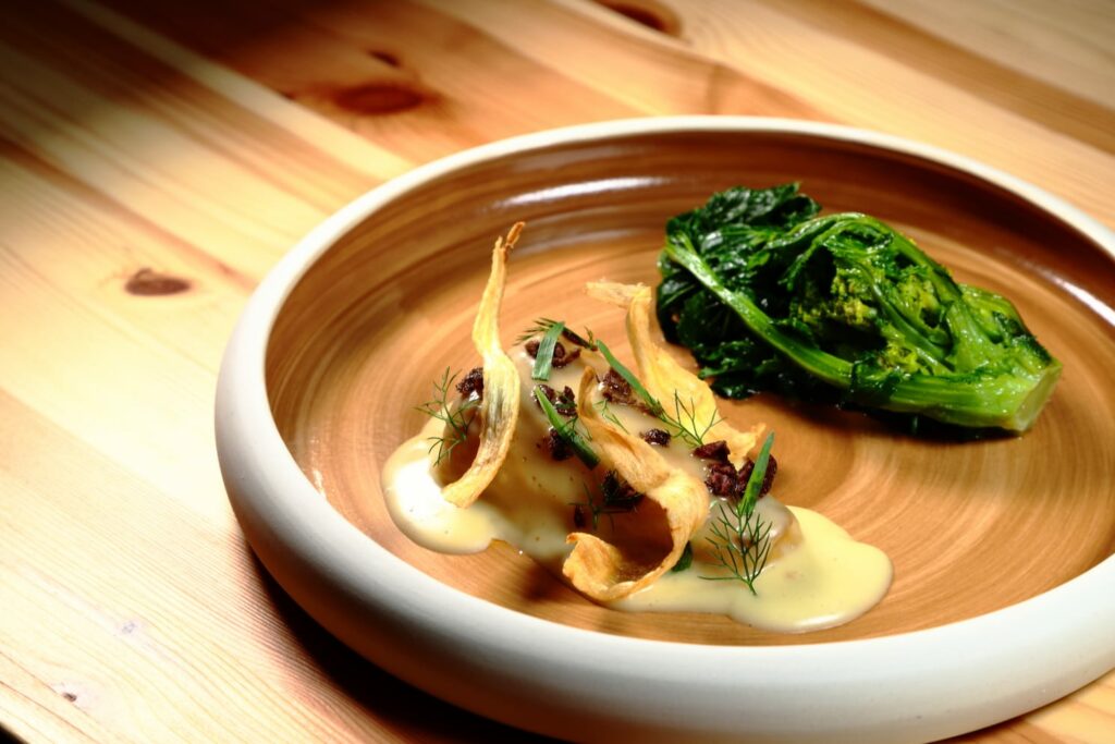 Nel bicchiere compare Nephelaia, Rosato Veneto IGT di Asja Rigato: rosa tenue e brillante, profumi di ribes, melograno e fiori delicati. In bocca è scorrevole e sapido, con acidità vivace e finale secco, capace di sostenere la complessità del piatto senza appesantire. La sequenza continua con la pastinaca al forno con beurre blanc vegetale all’alga wakame, olive taggiasche disidratate, dragoncello, finocchietto e chips di pastinaca. La radice, leggermente caramellizzata, risulta morbida e dolce; il beurre blanc introduce una cremosità vellutata con un discreto richiamo marino. Le olive aggiungono sapidità mediterranea, le erbe freschezza balsamica, mentre le chips completano con una nota croccante.