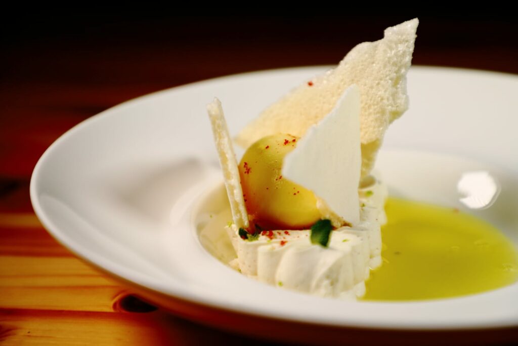 Arrivano quindi i tortelli senza uovo ripieni di cavolo nero e mandorla, con gel di ponzu, spuma vegetale di cavolfiore, taina al bergamotto, limone salato e chips di cavolo nero. Il ripieno è pieno e avvolgente, con il cavolo nero a dare carattere e profondità. Ponzu e limone salato portano acidità e sapidità, la spuma alleggerisce l’insieme, mentre la taina profumata al bergamotto firma il piatto con una nota agrumata raffinata.