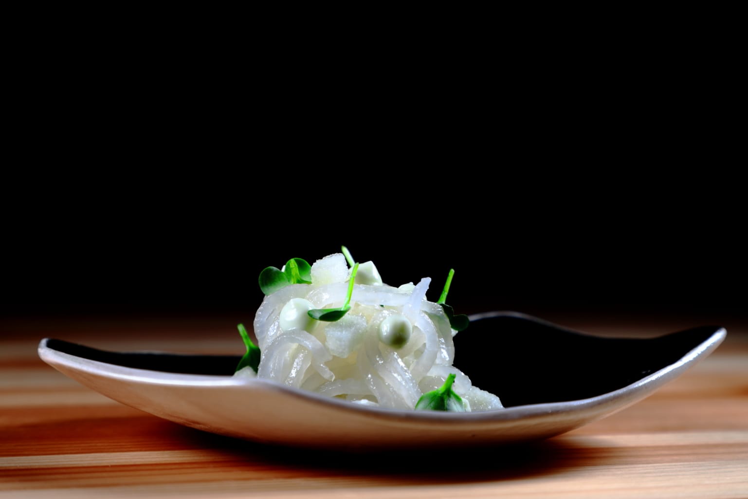 Il benvenuto è un piccolo manifesto di semplicità: grissini preparati con farine di grani antichi, una pagnotta ai semi di lino, farro e girasole e un filo d’olio servito in purezza. Un inizio essenziale, pensato per predisporre il palato senza forzature. Nel calice arriva Racconto 6 – Metodo Classico Brut Nature 48 mesi Blanc de Blancs. Giallo paglierino luminoso, perlage fine e continuo. Al naso emergono scorza di limone, cedro ed erbe aromatiche, seguite da lievi note di crosta di pane e da una mineralità quasi salina. In bocca è teso e verticale, con bollicina cremosa, acidità vibrante e una chiusura asciutta e sapida che accompagna con eleganza i primi assaggi. Il viaggio si apre con lo spaghettino di daikon agrodolce, mela verde, maionese vegetale all’aneto e germogli di daikon (foto di copertina). Un piatto costruito su freschezza e croccantezza: il daikon resta succoso, l’agrodolce dona ritmo, la mela verde aggiunge una nota fruttata e brillante. La maionese all’aneto avvolge con delicatezza, mentre i germogli completano con un leggero accento pungente.