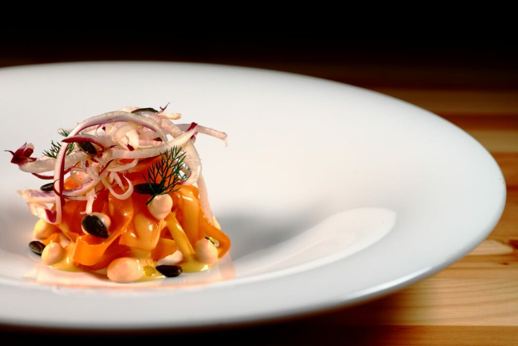 Un elemento distintivo è la formula del menu: non esiste una carta scritta. Si cena letteralmente “al buio”, affidandosi alla creatività della cucina. L’ospite può scegliere solo tra due percorsi degustazione, da tre o da cinque portate. Daniel Penazzato introduce a voce le verdure protagoniste della serata, ma ogni piatto resta una scoperta, un piccolo viaggio costruito sul momento secondo stagionalità e ispirazione.