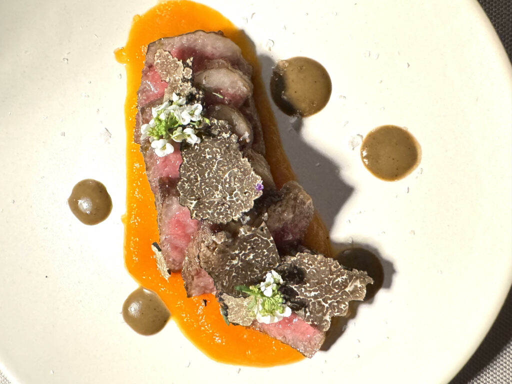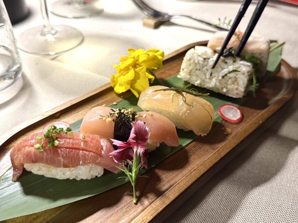 Particolarmente atteso il wagyu scottato servito con salsa di capperi e tartufo nero e purea di carote con yuzu, vero piatto forte della serata che ha conquistato l’apprezzamento di tutti i commensali per l’eccellenza delle sue carni e il perfetto contrasto tra dolcezza e sapidità. La zuppa di miso rosso con vongole e porro e il sushi (il riso in Giappone si serve a fine pasto come segnale che la serata giunge sul finire) hanno lasciato spazio al finale dolce con il Mizugashi, sorbetto di mango e lime con cannoli siciliani alla crema di ricotta di soia al matcha.