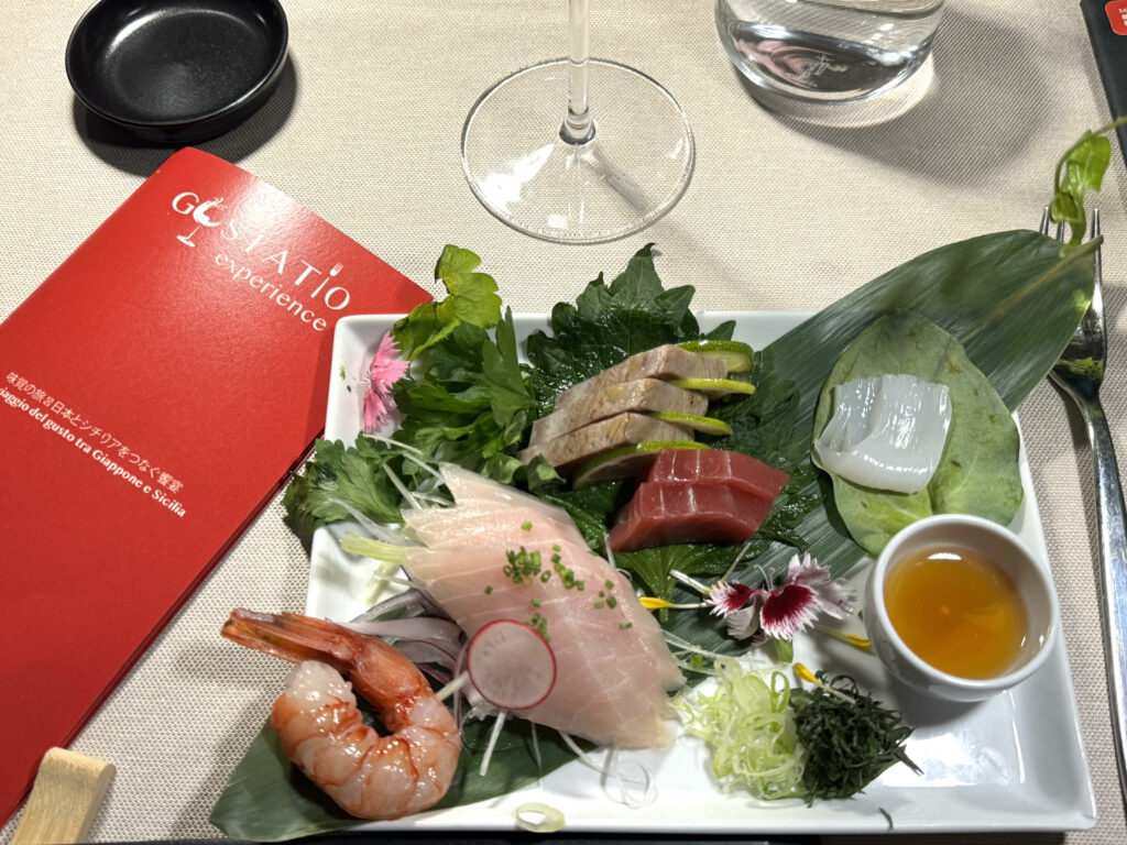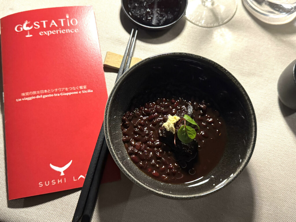 Il Sake Daiginio leggermente riscaldato e sorseggiato insieme al Nimono, polpo stufato con fagioli e zenzero, si è fatto apprezzare insieme al piatto a cui ha regalato un perfetto bilanciamento dei sapori, contrastandone la dolcezza. La degustazione di Sakè è stata magistralmente condotta da Giuseppe Nobile, agronomo, tecnologo alimentare e master Sake Sommelier per Saké Company che poi ha lasciato spazio, per la seconda parte della cena, a Giuseppe Lo Presti dell’Enoteca La Botte, membro dell’associazione Gustatio che ha curato la selezione di vini: lo spumante extra brut Sicilia DOC 2020 di Alessandro di Camporeale, il Grillo Laluci 2024 di Cristo di Campobello e l’Etna Bianco DOC 2023 di Baglio di Pianetto.