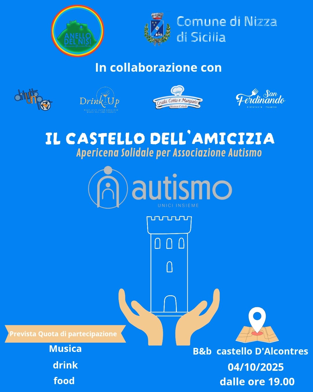‘Il Castello dell’Amicizia’: una serata tra musica e buon cibo per sostenere le attività dei laboratori di inclusione socio lavorativi del Centro per l’Autismo di Nizza di Sicilia. L’evento si svolgerà sabato 4 ottobre, dalle ore 19, nella storica e suggestiva e dimora del Castello d’Alcontres, organizzato dal Comune di Nizza di Sicilia insieme all’associazione Anello del Nisi. Il percorso gastronomico è firmato dalle cucine del ristorante ‘San Ferdinando’, da ‘Crudo, Cotto e Mangiato’ Coledi bistrot, e il supporto di ‘Di tutto un po’’ e ‘Drink up’.