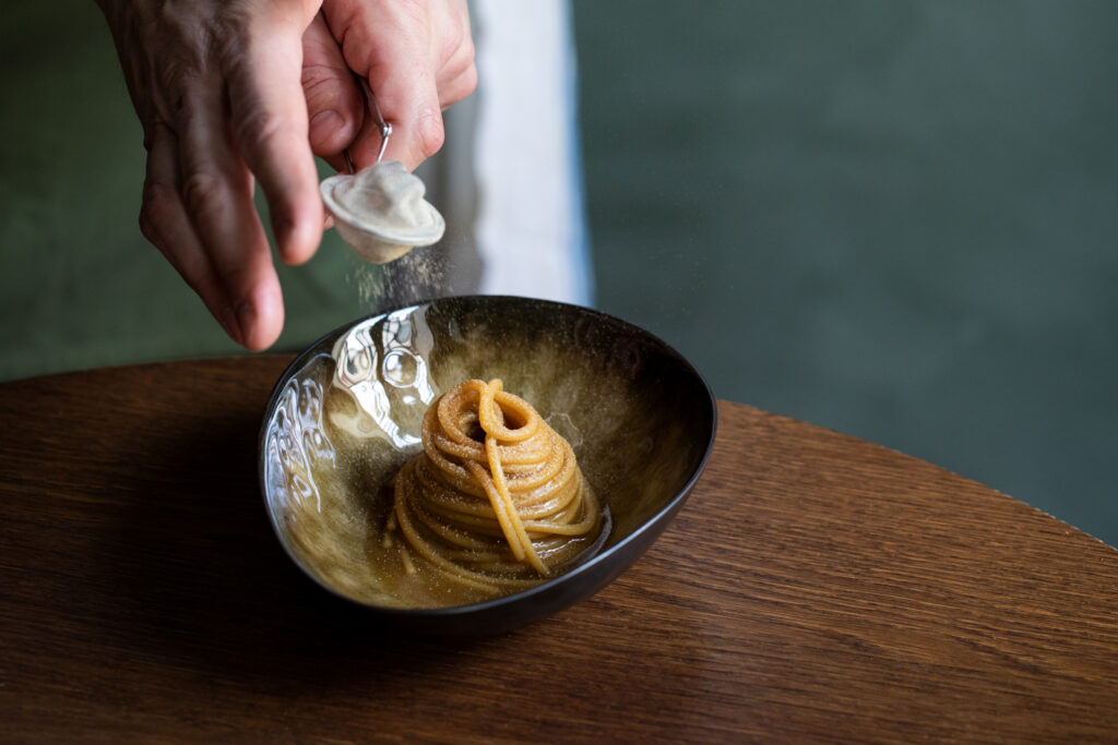 Tra questi, un piatto che racchiude la storia dello chef al Local è Anguilla, cicoria e polvere di tamarindo, cibo che lega fortemente Napoli a Venezia. Una maturazione di 7 giorni e una cottura lunga a bassa temperatura, per rendere estrema la morbidezza. E il passaggio in teppanyaki, a regalare un profumo affumicato e croccantezza al morso. A bilanciare il tutto, una salsa al tamarindo, emblema di Venezia, porta della via delle Spezie verso l’Oriente. I suoi Bigoli in salsa rappresentano in chiave moderna un piatto iconico veneziano. Il brodo viene ossidato, regalando una lunghezza importante e alleggerendo la presenza della cipolla. Al posto delle sarde, un garum di acciughe home made. Tecnica e conoscenza al servizio della tradizione, in un piatto in cui il minimalismo resta il filo conduttore principe. E ancora Kimchi di radicchio di Treviso e salsa al lievito, l’ Anatra, Porro e Polline, tra i dessert Cioccolato, salicornia e burro nocciola. Un menù tutto da scoprire.