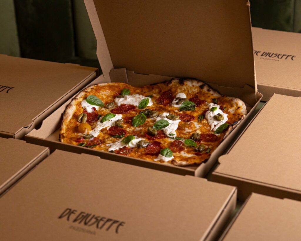 Da De Giuseppe Pizzeria, il menu nasce con l’ambizione di raccontare la Calabria. La protagonista è la Pizza Cosentina con farine tipo 0 o 1, un’idratazione al 70%, panetti da 180 g e una lievitazione naturale di 24–48 ore. La cottura nel forno elettrico restituisce una base croccante e omogenea, cornicioni bassi e una struttura che sostiene con equilibrio i condimenti. Ed è proprio sui condimenti che Pasqualino ribadisce il legame con la Calabria: pomodoro Migliarese, fior di latte Bio della Sila, verdure e conserve locali, salumi di suino nero.