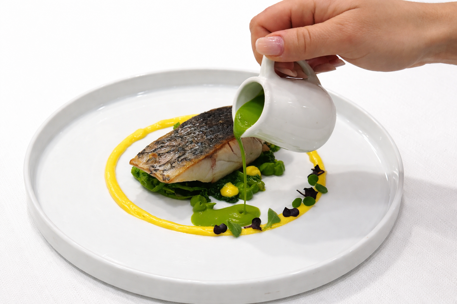 Per l’impiattamento, disporre le cime di rapa al centro del piatto, adagiare sopra il filetto di ombrina e completare con la crema di patate, distribuendola con lo squeezer per creare punti o decorazioni eleganti che diano movimento e armonia al piatto.
