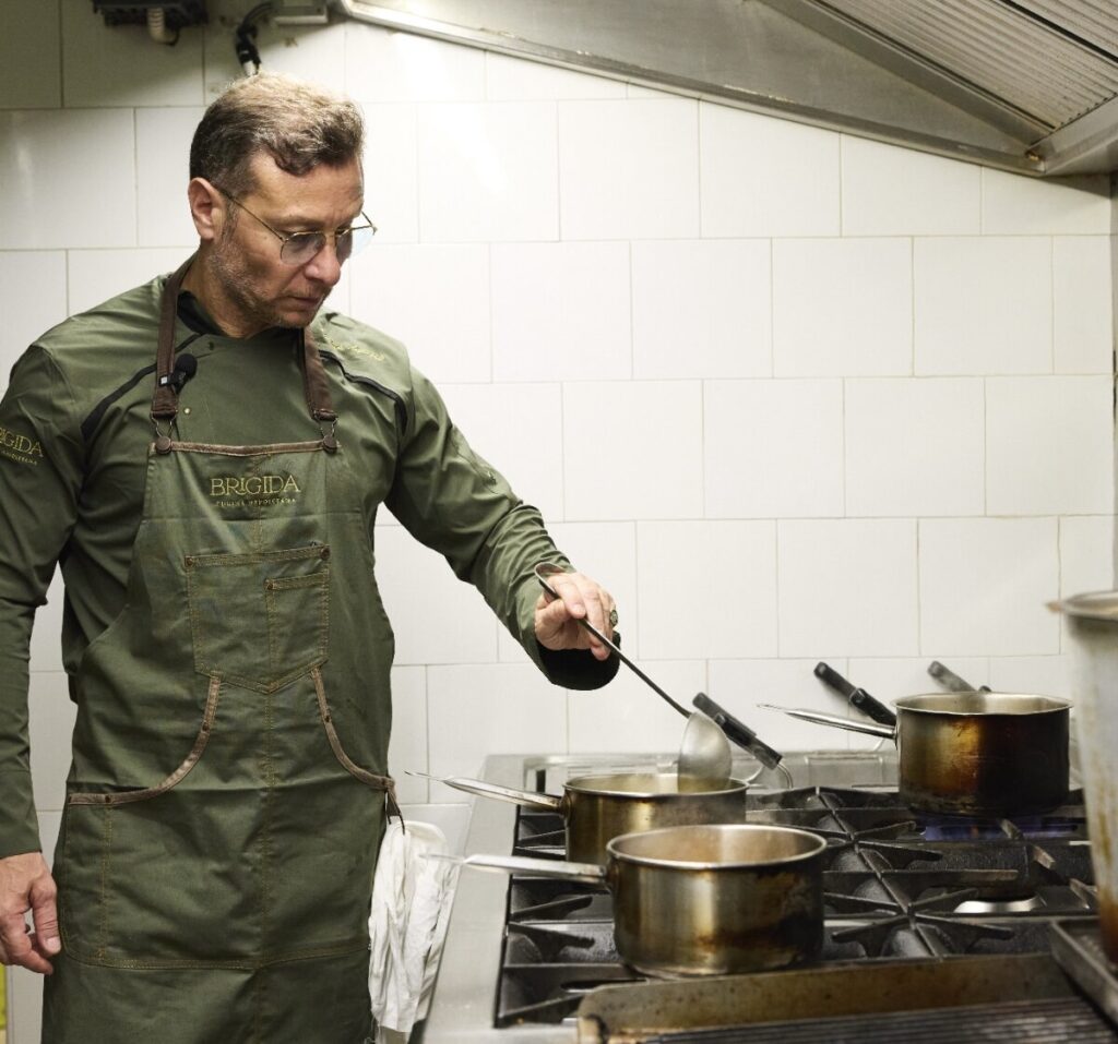 Brigida nasce da un’idea di Gianluca Amoroso, moderno oste e padrone di casa con una lunga esperienza nel mondo della ristorazione, insieme al socio Michele Caruso. Amoroso è il cuore del progetto: ogni giorno accoglie gli ospiti in sala, raccontando con dedizione e passione i piatti in carta, il lavoro che c’è dietro ogni ricetta e la scelta delle materie prime.