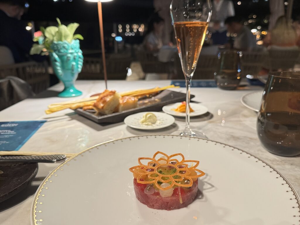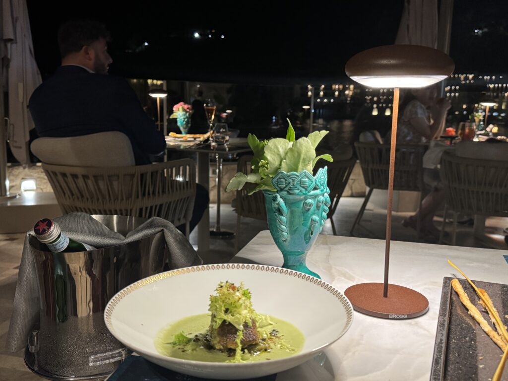 La serata, aperta da un aperitivo di benvenuto, è stata caratterizzata da un percorso degustazione inedito, costruito a quattro mani e accompagnato da una selezione di vini curata dalla sommelier e Restaurant Manager del Mazzarò Sea Palace Dana Muscalu. Un abbinamento studiato per esaltare ogni piatto, spaziando tra bollicine francesi ed eccellenze vinicole dell’Etna, in un raffinato equilibrio tra eleganza e identità territoriale.
