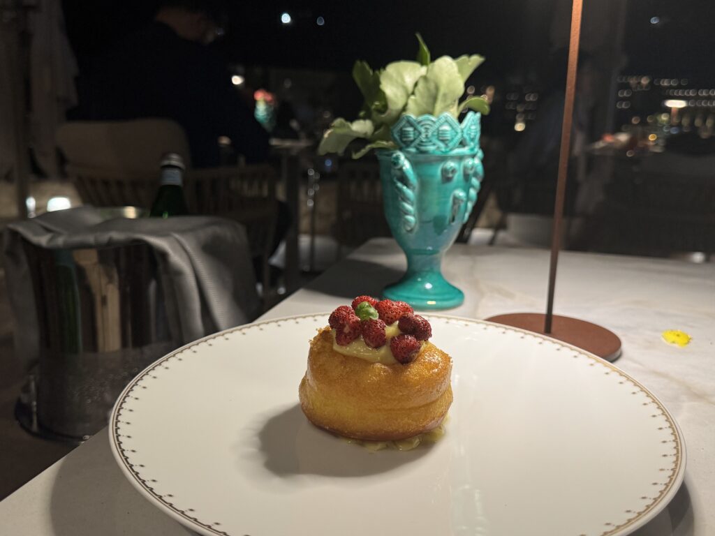 Il fresco pre-dessert firmato da Fazio “Limone, Cioccolato e Verbena” ha lasciato spazio alla vera tradizione pasticcera campana con il babà con crema e fragoline di bosco di Gennaro Esposito accompagnato dalle seducenti note della Malvasia delle Lipari di Capofaro a chiudere una serata di grande cucina d’autore firmata Blum.